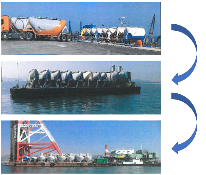 Bulk Carrier is mobilized to supply bulk cement from land to the bulk cement Silo on the main barge as shown below.