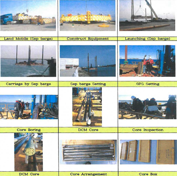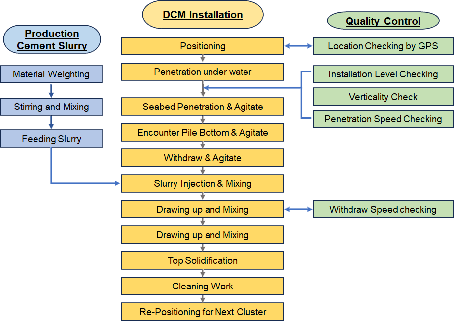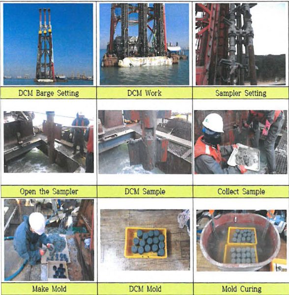 DCM is a kind of soil improvement work method using cement paste which is mixture of cement and water in the soft soil. While injecting cement paste which is mixture of cement and water into the soft soil (clay, sand, organic soil) with low pressure to make agitation of soft soil and cement paste by special agitation device to form column piles by cementation of the original soil workable water depth is up to -34 meter and this method is a pro- environmental method with little sound and little vibration and is giving little impact to adjacent soil to have high credibility. Cement Paste is made in the plant and sent to the DCM barge by pressure pump. The targeted area of soft soil is evenly agitated mixed and hardened and consolidated to secure a bearing capacity not less than the