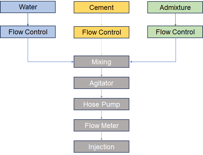 The mixing plant shall comprise colloidal mixers, volumetric screw feeders, and flow controllers. Dry materials shall be stored in silos and fed by screw feeders to the colloidal mixers for agitation and circulation. The mixed cement slurry shall be transferred to an agitator with additional mixing and then fed to the DCM rig as shown below.