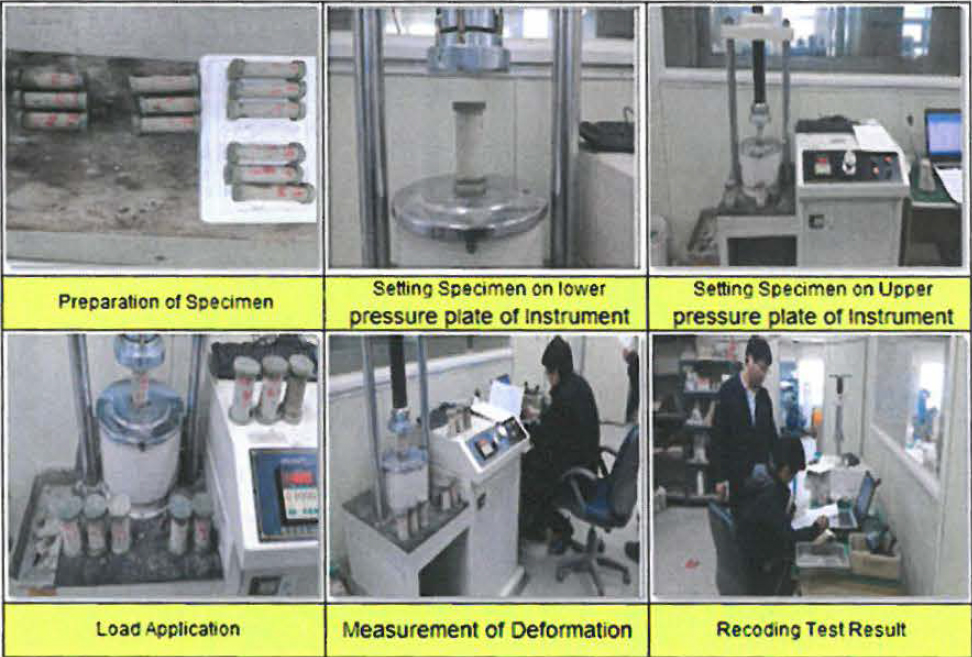Specimens from mold are prepared by cutting them to the specified length and are thereafter ground and measured. There are high requirements on the flatness of the end surfaces in order to obtain an even load distribution. The testing is in accordance with relevant procedures such as KS F 2314. See Figure 4.