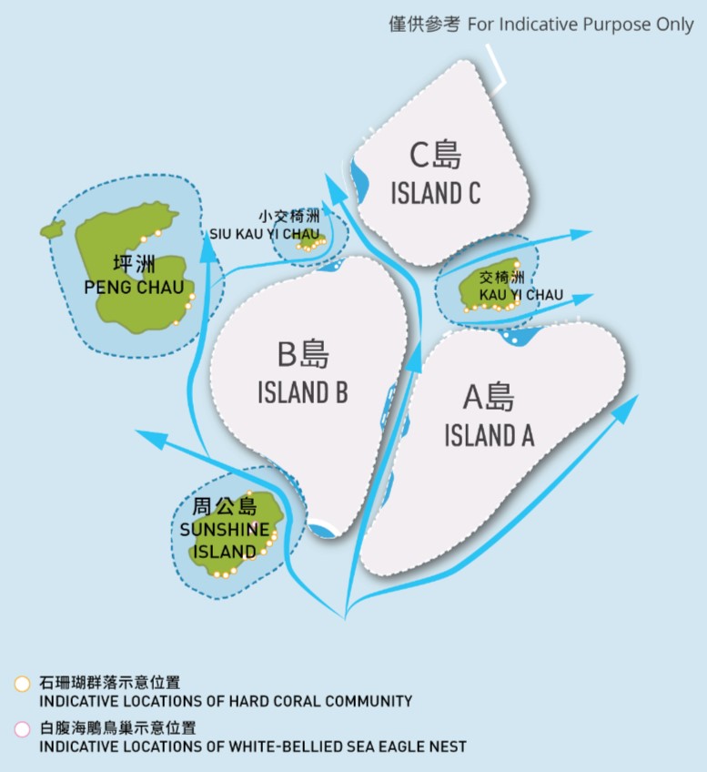 In June 2021, the Civil Engineering and Development Department and the Planning Department jointly commenced a consultancy agreement “Artificial Islands in the Central Waters – Investigation” (the Study) for completion within 42 months. The scope of the Study mainly comprises a detailed planning and engineering study for the artificial islands of about 1 000 ha around Kau Yi Chau, and a feasibility study on the priority road link and priority rail link connecting the artificial islands.